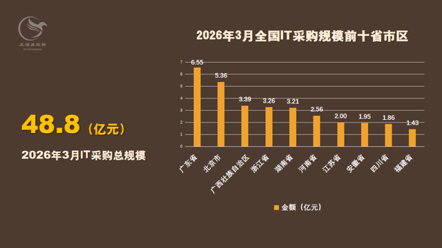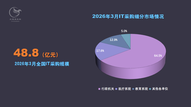 从细分市场来看,3月,行政机关IT采购项目数量1054个,采购规模31.5亿元,占3月全国IT采购总规模的64.5%,排名第一。最大项目为义乌市全域物联感知基础设施提升项目(一期)——智能视频监控全域覆盖子项目,采购人为义乌市数据管理中心;医疗系统IT采购项目数量217个,采购规模8.6亿元,占3月全国IT采购总规模的17.6%,排名第二。最大项目为郑州市中心医院国家创伤区域医疗中心信息化建设项目,该项目采购应用软件、机房设备、网络安全设备等,中标供应商为北京山石网科信息技术有限公司;教育系统IT采购项目数量302个,采购规模6.3亿元,占3月全国IT采购总规模的12.9%。最大项目为中国科学院计算机网络信息中心人机物融合信息基础设施创新与试验平台项目枢纽节点及中国科技网终端节点链路(第一批)采购项目,中标金额5098.8万元。