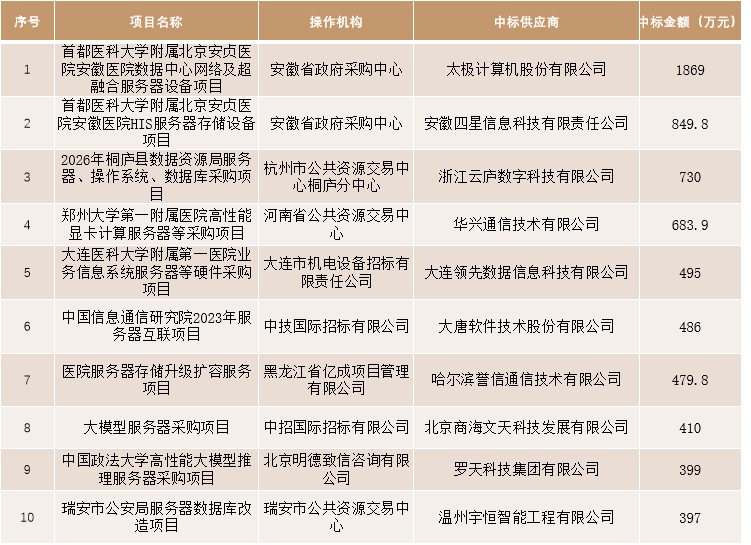 从细分市场来看,3月,行政机关IT采购项目数量1054个,采购规模31.5亿元,占3月全国IT采购总规模的64.5%,排名第一。最大项目为义乌市全域物联感知基础设施提升项目(一期)——智能视频监控全域覆盖子项目,采购人为义乌市数据管理中心;医疗系统IT采购项目数量217个,采购规模8.6亿元,占3月全国IT采购总规模的17.6%,排名第二。最大项目为郑州市中心医院国家创伤区域医疗中心信息化建设项目,该项目采购应用软件、机房设备、网络安全设备等,中标供应商为北京山石网科信息技术有限公司;教育系统IT采购项目数量302个,采购规模6.3亿元,占3月全国IT采购总规模的12.9%。最大项目为中国科学院计算机网络信息中心人机物融合信息基础设施创新与试验平台项目枢纽节点及中国科技网终端节点链路(第一批)采购项目,中标金额5098.8万元。